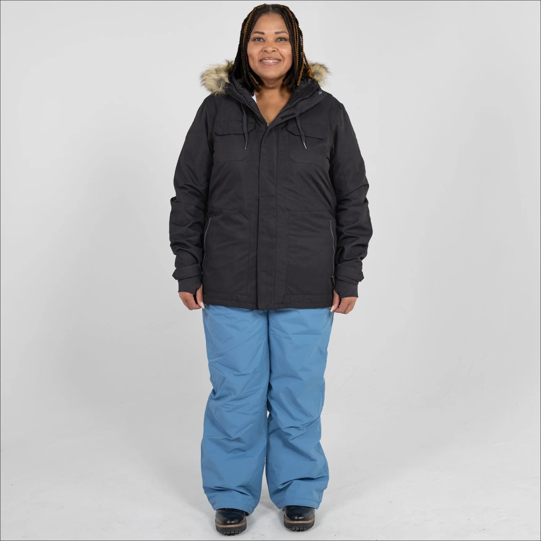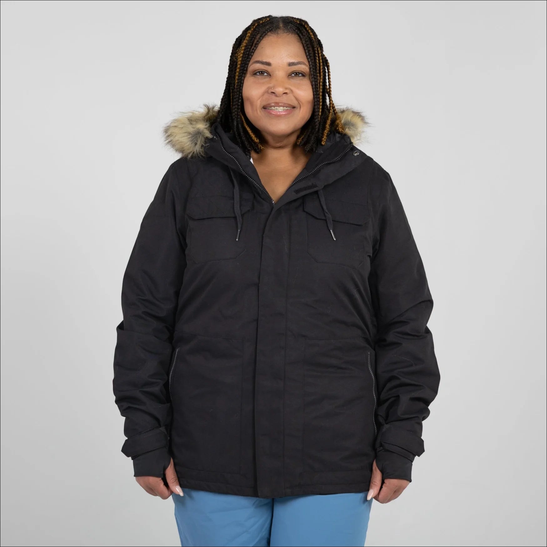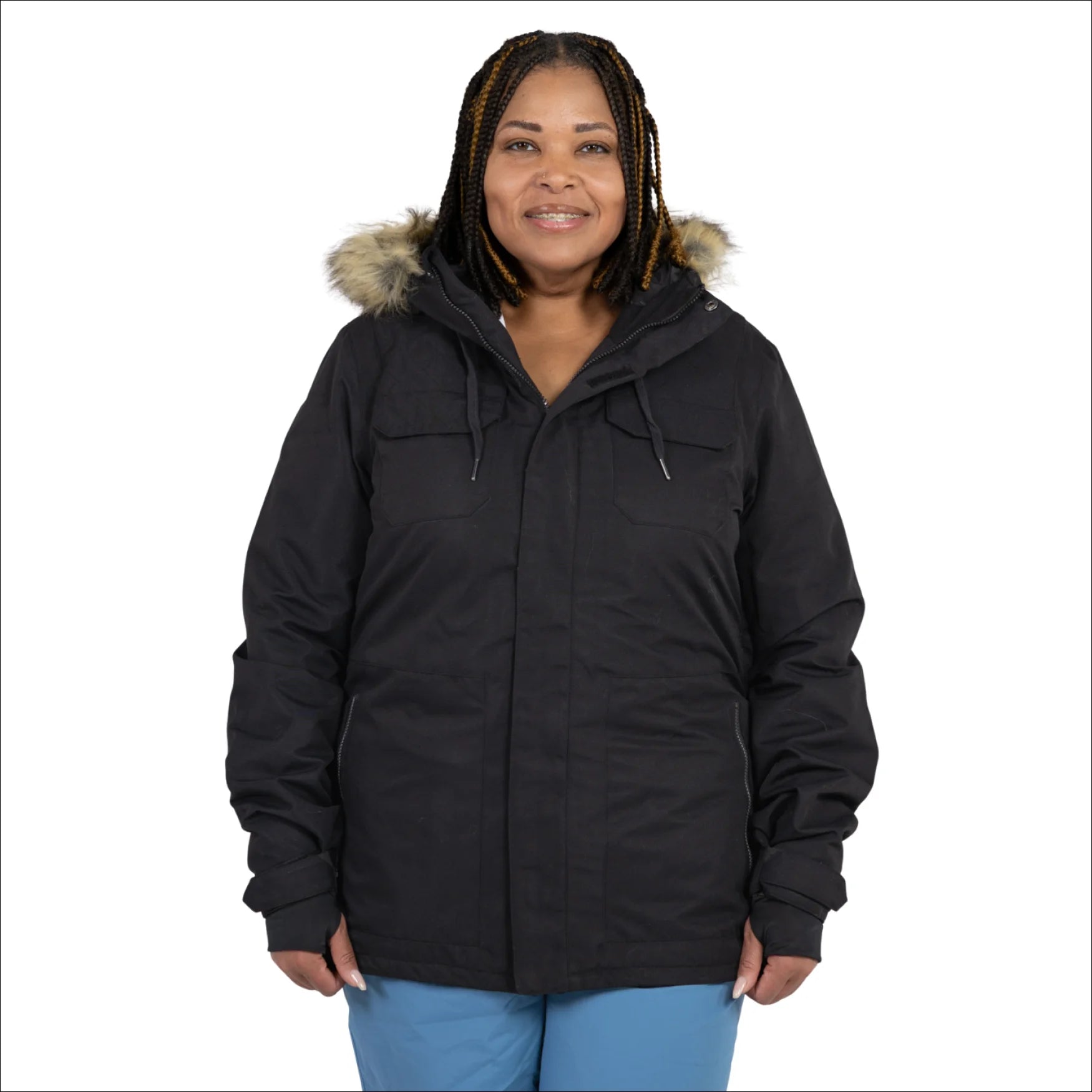 Attached insulated hood with removable faux fur trim: Look fabulous and stay cozy with the attached insulated hood featuring a removable faux fur trim. It's like having your own personal style statement that keeps you warm!